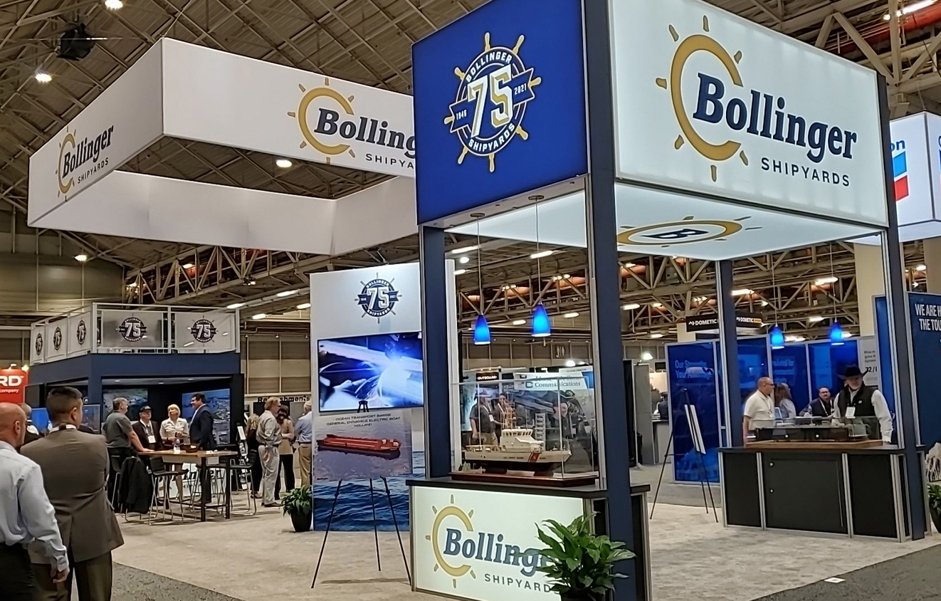 The International WorkBoat Show is a New Orleans trade-only conference and expo for commercial vessel owners, operators and builders, along with vendors and suppliers that serve them. In this particular year, Bollinger Shipyards envisioned changes to their traditional booth space for a special reason: their 75th anniversary. The task was to maintain its overall familiar space, while including a new structure that would allow attendees to view their special 75th anniversary video. After proposing a few concepts, the final result was an 11′ triangular tower, each side with a 75″ monitor display that allowed attendees to view the video from multiple angles and distances, including from the top of the double deck. In addition, other minor changes to the overall graphics were made in order to fully encapsulate the celebration of their 75th year in business.